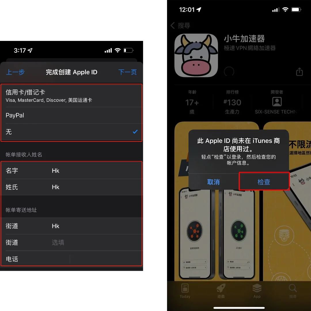 新的 Apple ID 在首次下载软件时,会要求设定 Apple ID 的一些信息,如图中所示,请点击 “检查” ,然后按照提示逐步操作即可,需要注意的是付款方式不要做任何选择,其它的内容可随意填写。下载完成小牛加速器后,您可以随时把 Apple ID 切换回原来的中国大陆帐号,当然您也可以在香港商店中下载各种海外热门应用,小牛全部都能支持!